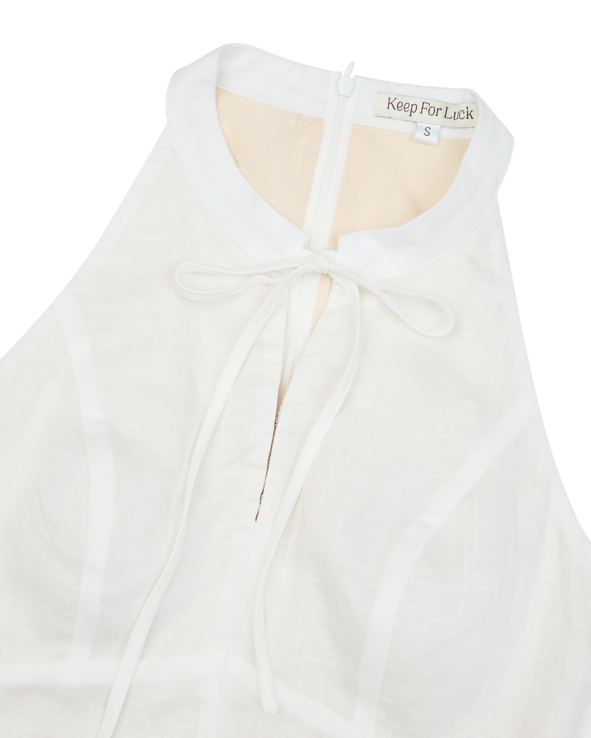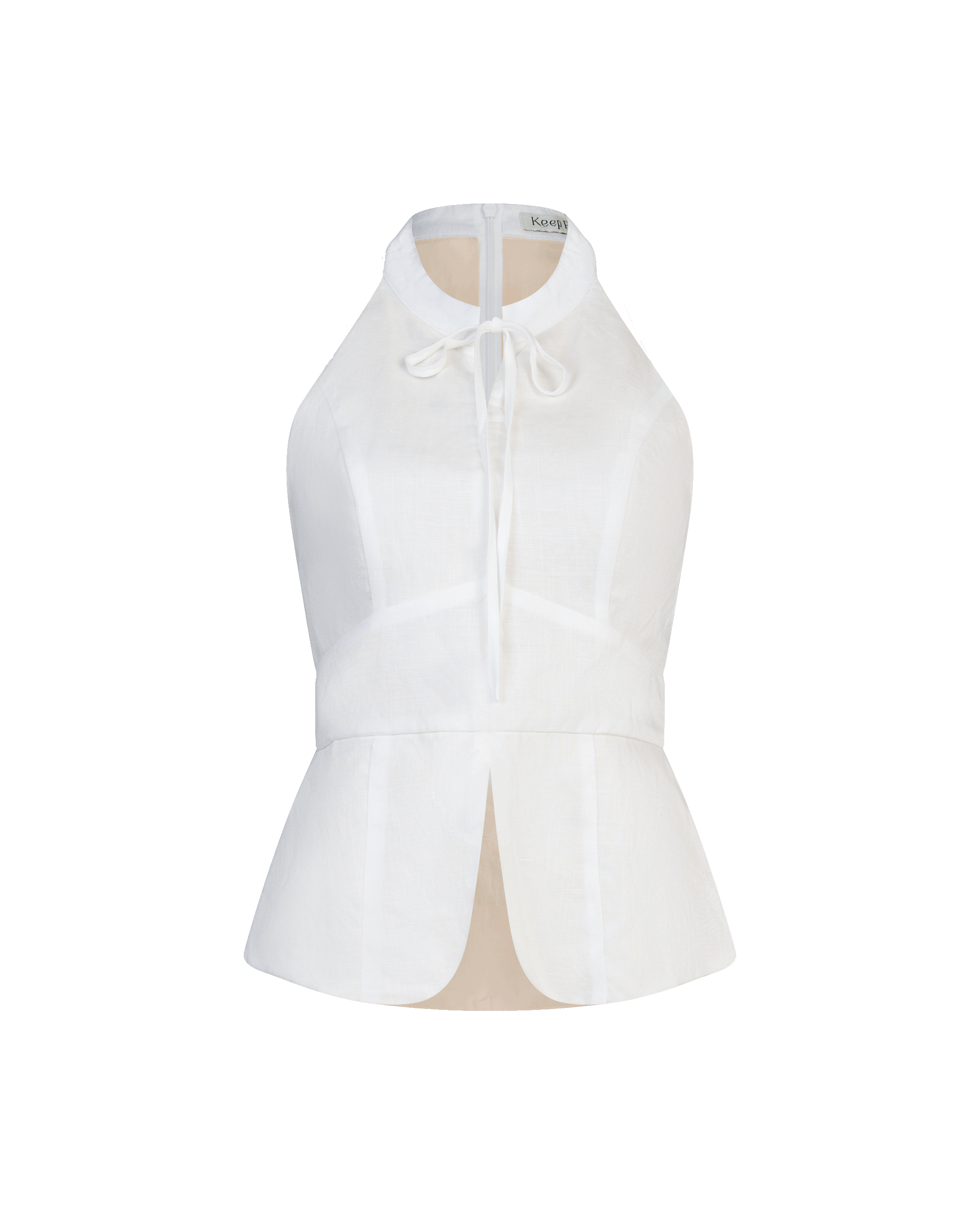 Classic, but make it interesting. This linen top reimagines the mandarin collar with a clean widened halter cut and a soft tie detail at the neckline.