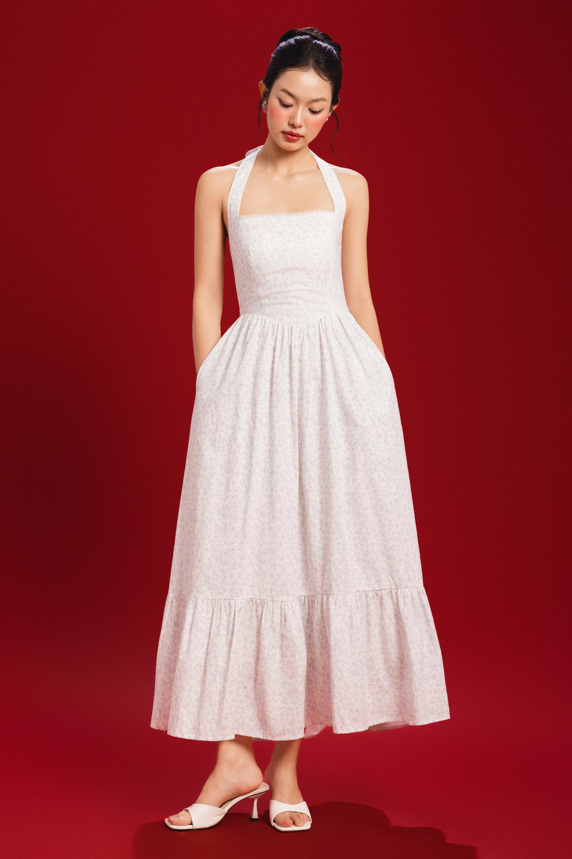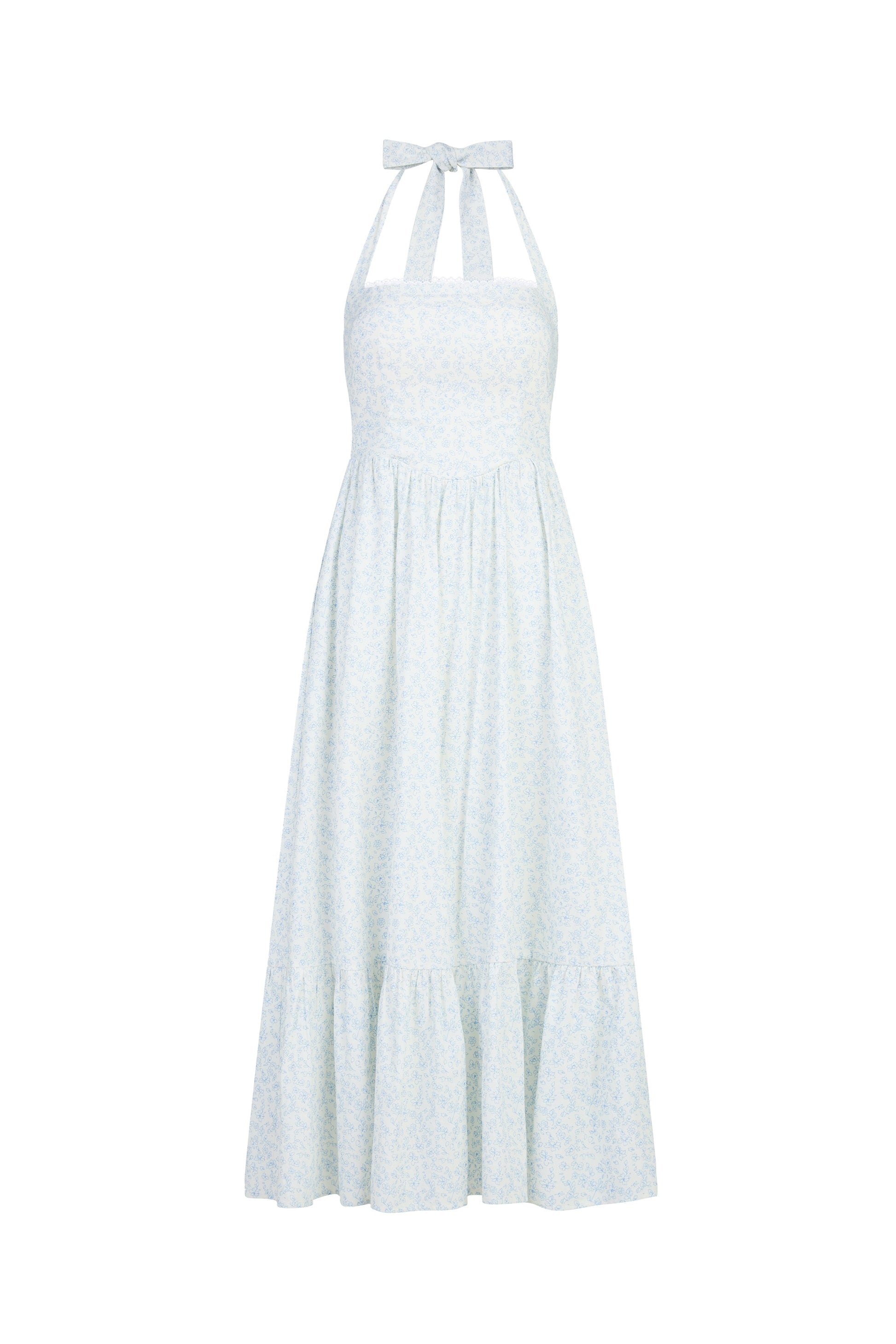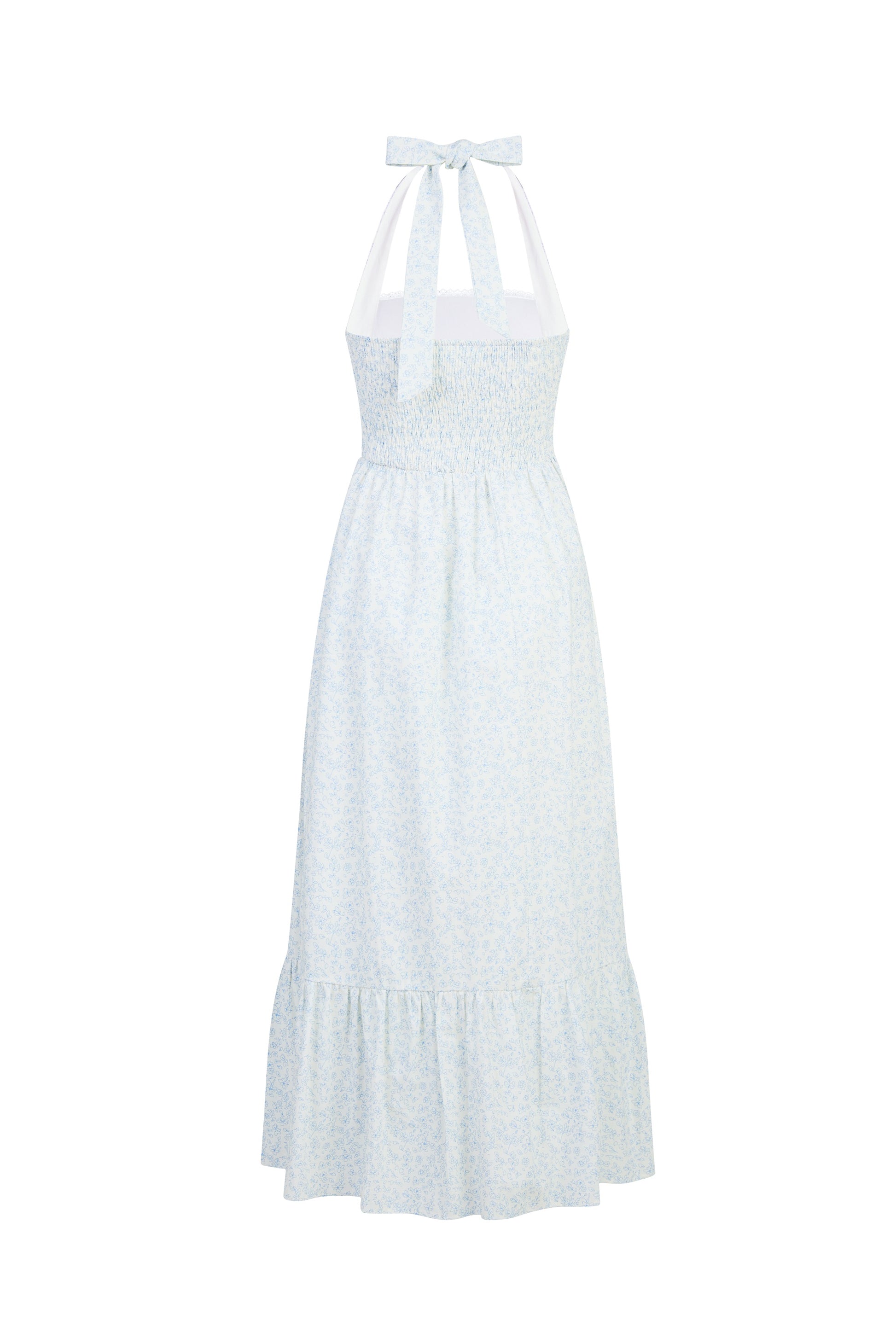 This halter maxi features a padded bodice and a smocked back that offers a flexible fit. Crochet lace trimming along the neckline adds a delicate vintage touch, while the halter cut draws attention to the shoulders.