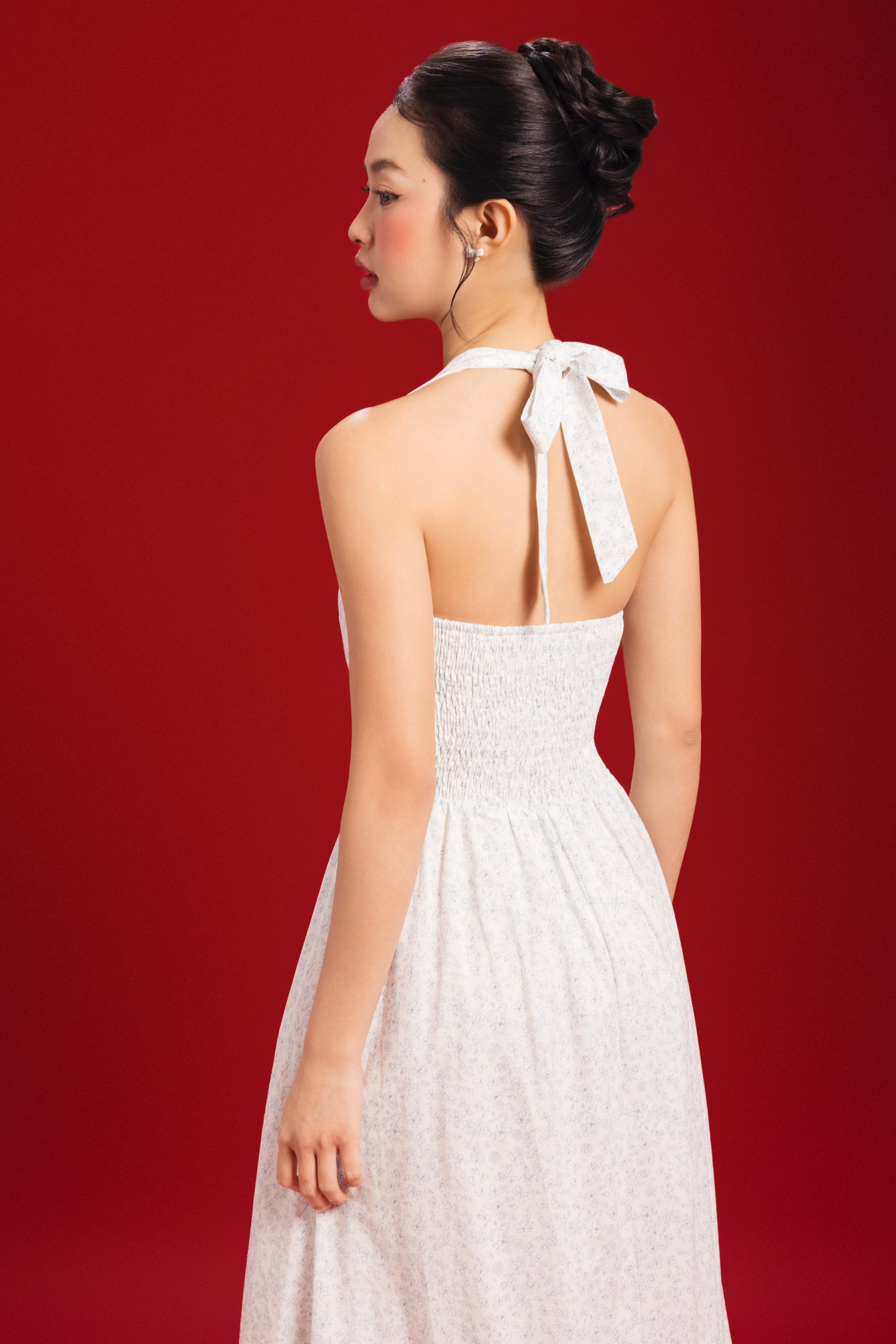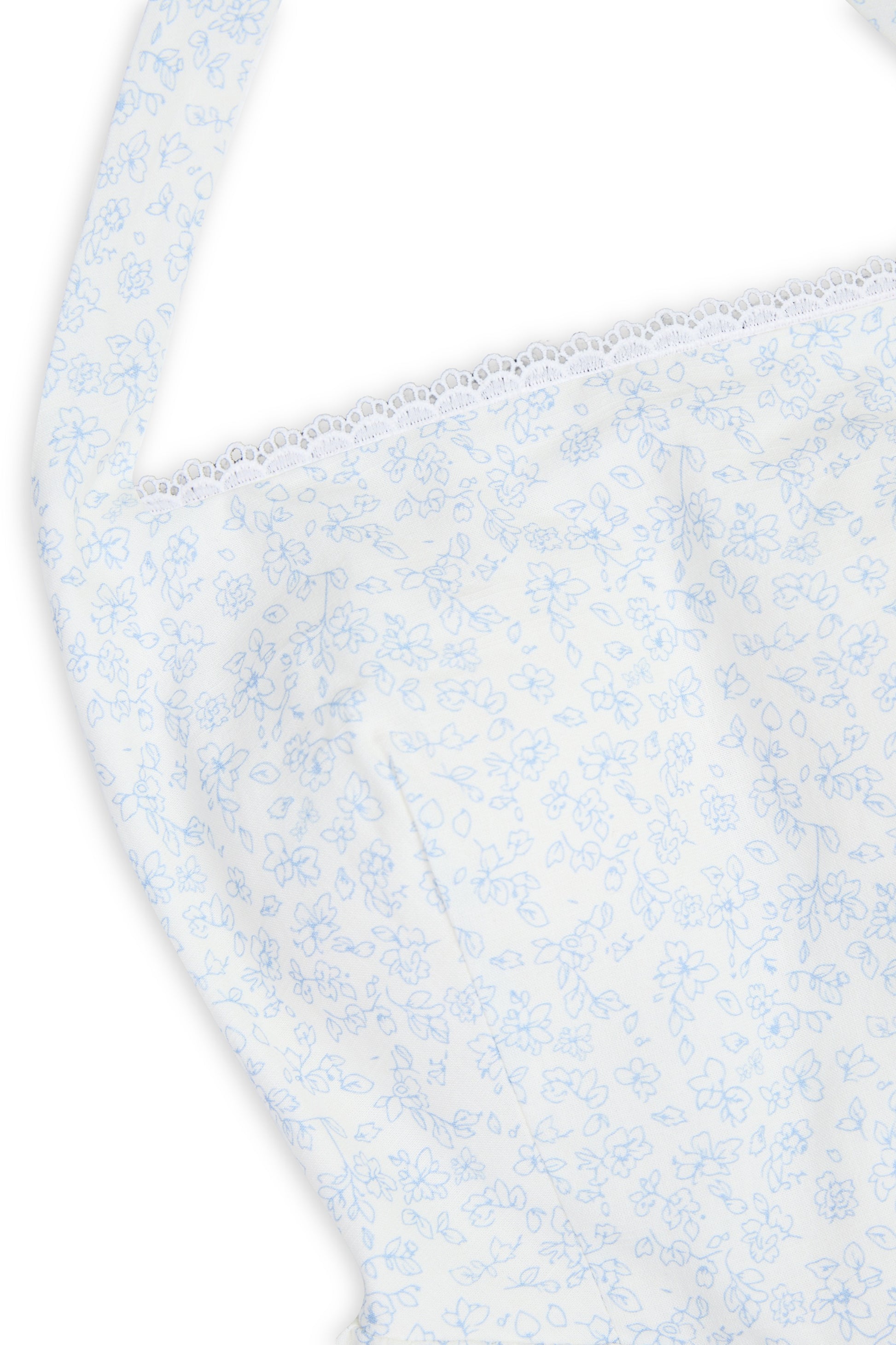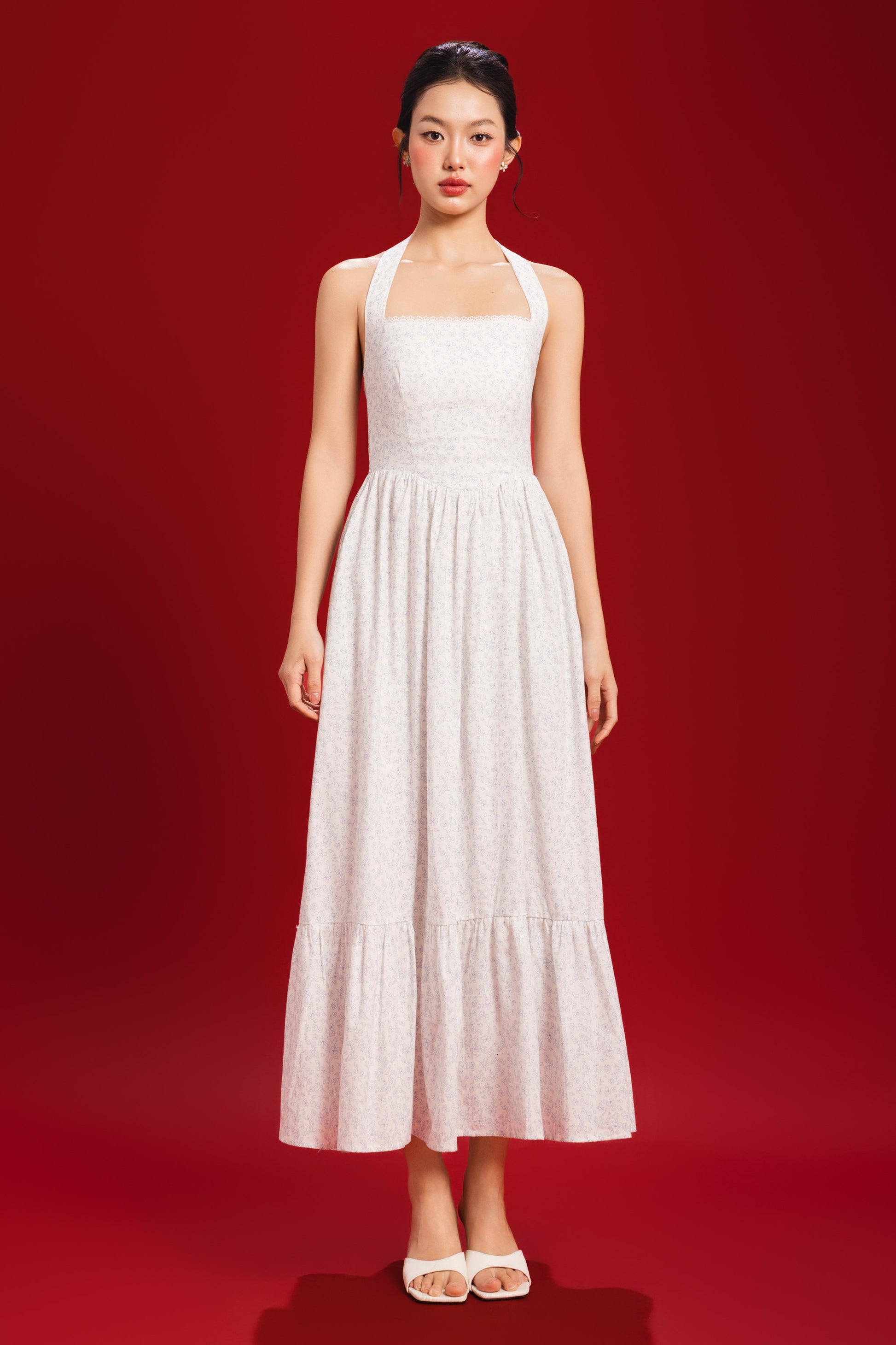 This halter maxi features a padded bodice and a smocked back that offers a flexible fit. Crochet lace trimming along the neckline adds a delicate vintage touch, while the halter cut draws attention to the shoulders.