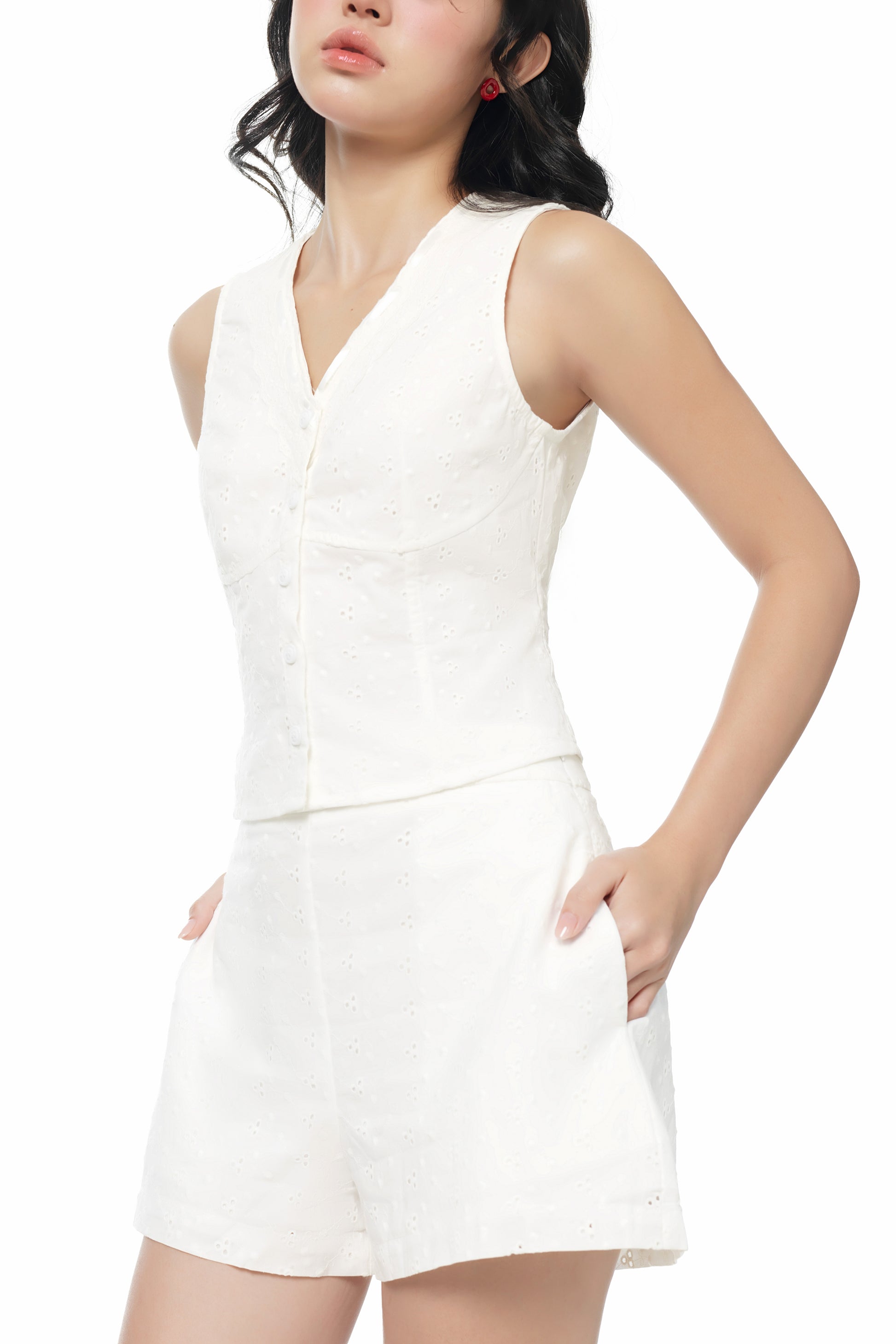 Effortlessly breezy yet polished, the Soft Spot Lace Trim Eyelet V-Neck Top and Short Notice Eyelet A-line Shorts are your ultimate summer set. Made from matching breathable eyelet, they bring casual charm with a put-together edge, perfect for hot days. Pick from white or navy and step out looking weekend-ready without trying.