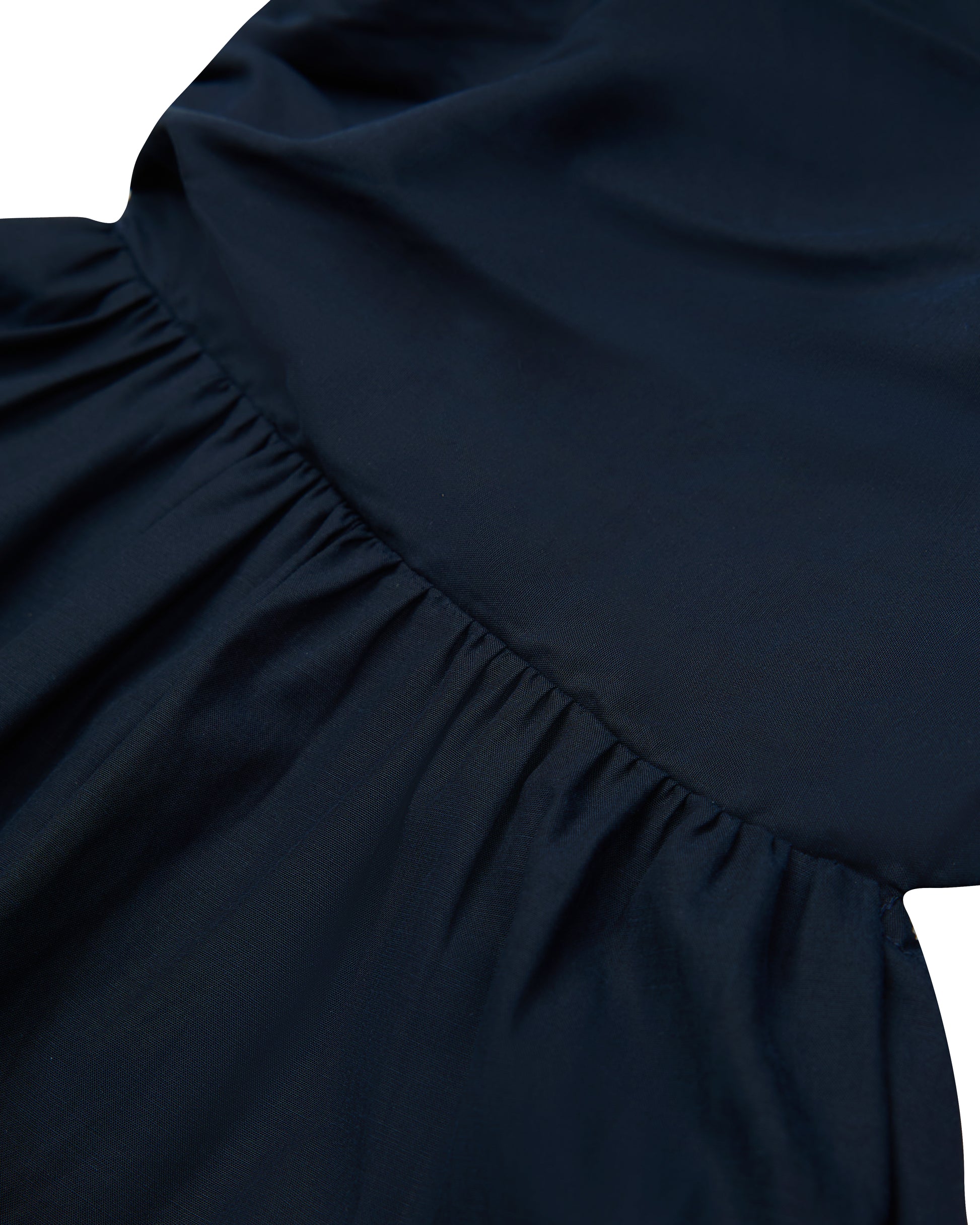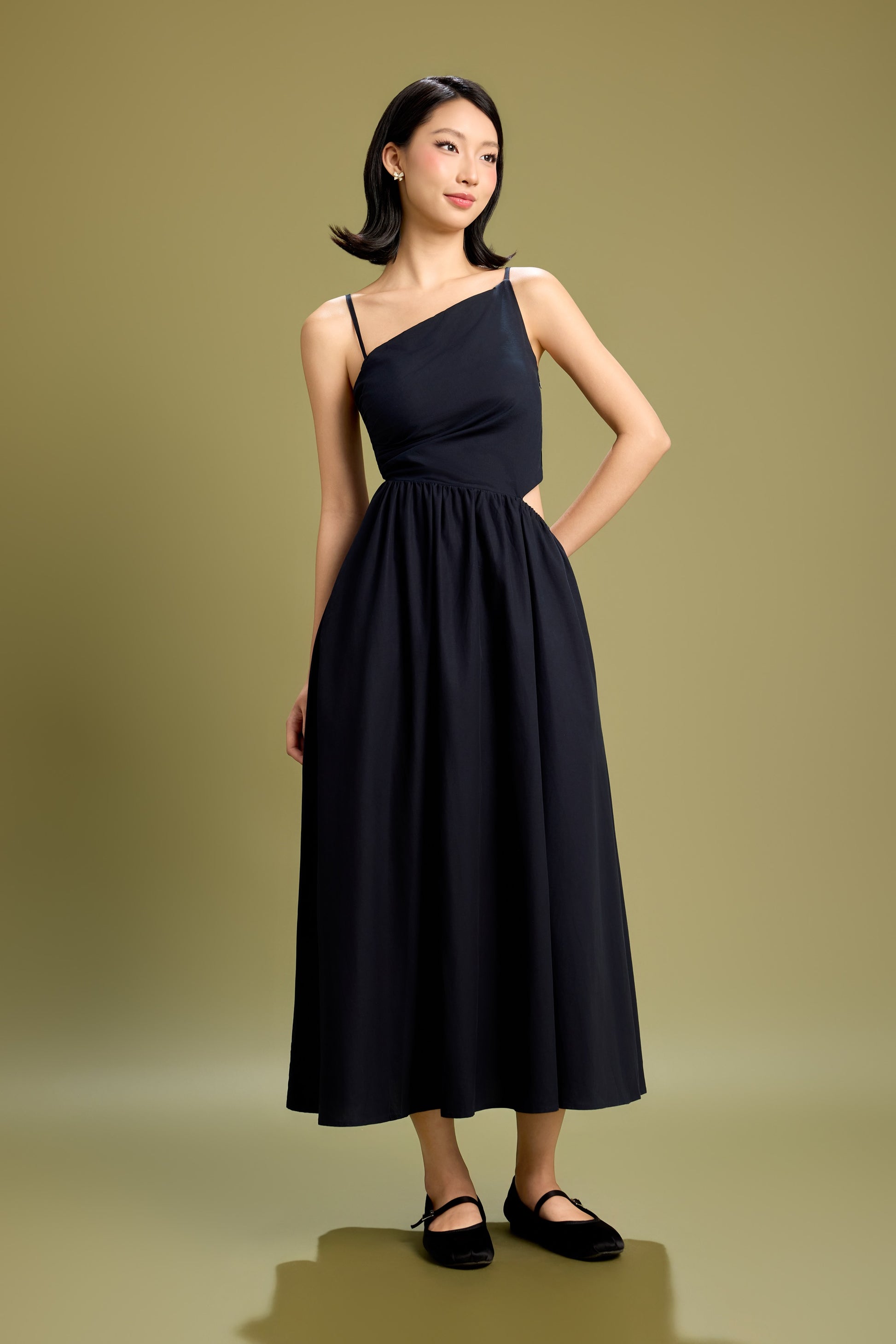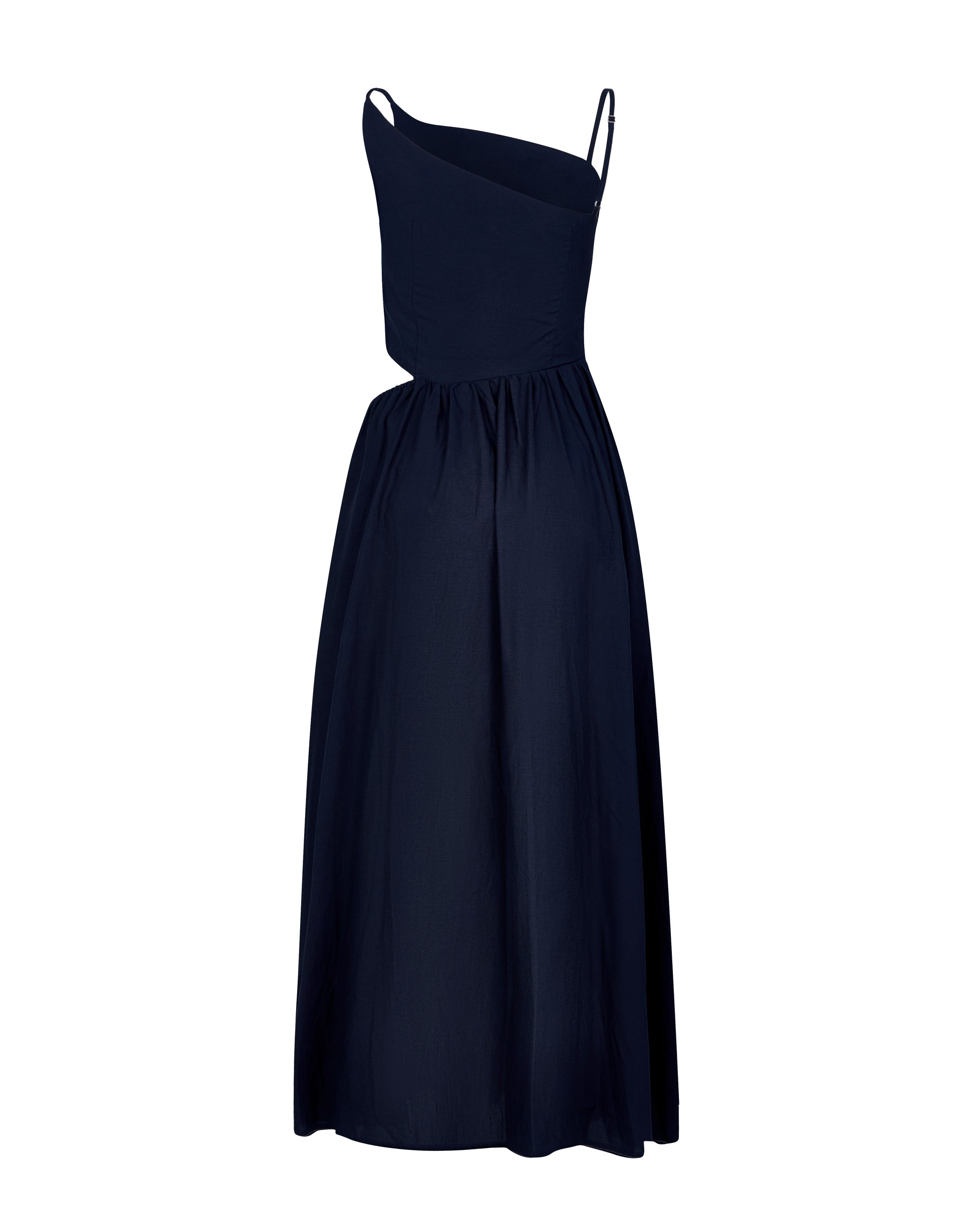 Cut from a soft linen-cotton blend with a fluid drape, this dress is designed to flatter with quiet confidence. It features a refined asymmetrical neckline, balanced by an adjustable shoulder strap for a personalised fit. A peek-a-boo waist cut-out on one side, complemented by an elasticised waist that shapes gently without feeling restrictive.